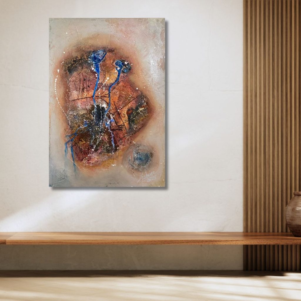 Ein erdiges Zentrum in warmen Brauntönen, durchzogen von leuchtend blauen Linien. Texturen und Schichtungen schaffen Tiefe, während weiße Sprenkel Bewegung andeuten. Unten rechts eine kreisförmige Struktur, fast wie ein Tor. Das Werk wirkt archaisch und organisch, zugleich durch das Blau belebt – ein Eindruck von innerer Energie, die nach oben steigt.