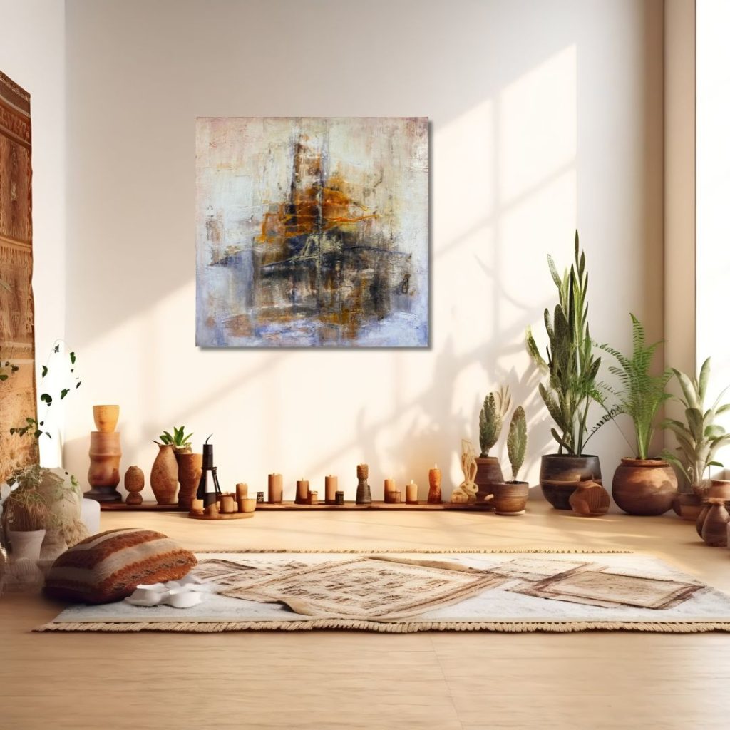 Die Farbgebung – zurückhaltend und zugleich voller Tiefe – wirkt wie ein alchemistischer Prozess: Dunkelheit, Rost, Ocker und Indigo verbinden sich zu einer Erinnerung an die Wandlungsfähigkeit unserer Seele. In dieser Stille liegt Kraft – wie der stille Atem des Kosmos, der durch unser Innerstes strömt.